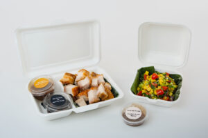 Our version of crispy pork strips is brined and boiled a day ahead and cautiously cooked in an air fryer – NOT deep fried – less mess and less oil. It is usually accompanied with a dipping sauce. Our dish is served with two types of dipping sauces: sweet, gingery peanut butter dipping sauce (a combination of savory, spice and sweetness) and the spicy soy sauce and sugar cane vinegar dipping sauce.