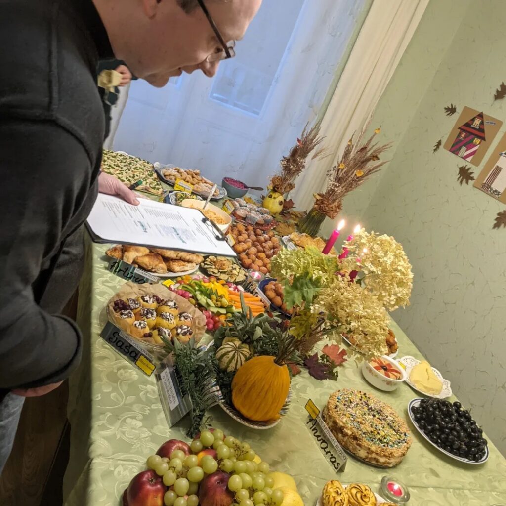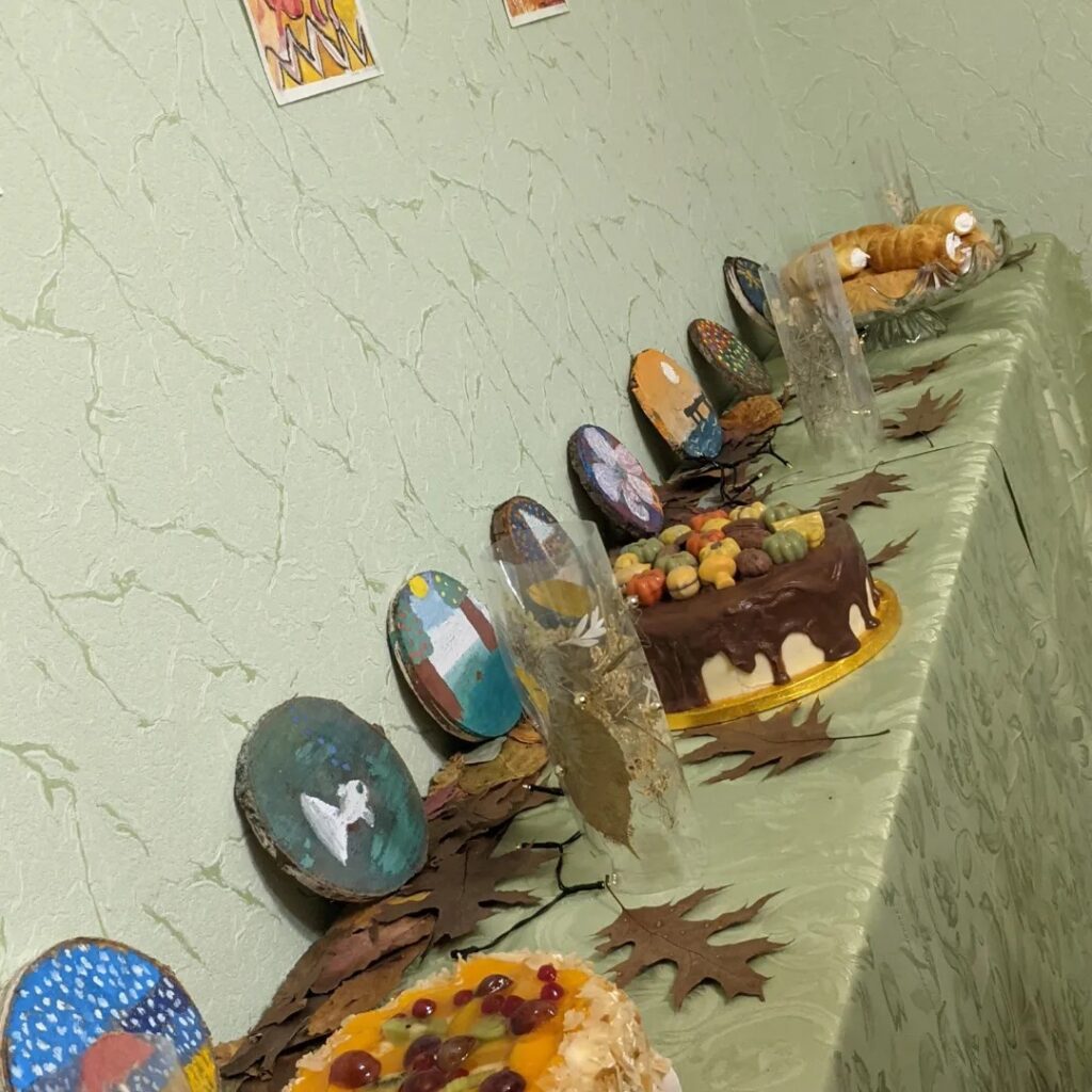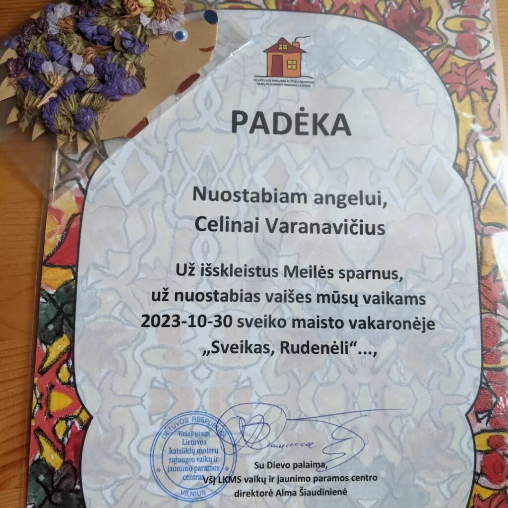 ENG – October 30, 2023. Once again Merienda was requested to give a cake for the children and carers (auklėtojams) under VŠĮ “Žmonės Žmonėms” during their autumn festival. We were delighted to participate as judges of their food creations and flower bouquets. some were awarded as most unique, most colorful, most autumnal, most creative, and many more. I also received a very beautiful present from the children which they made themselves. Thank you again for this opportunity Sandra Balnienė !